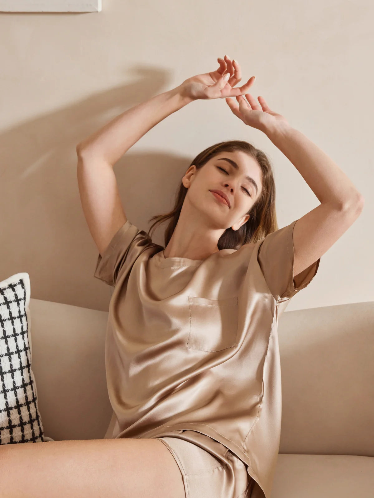 Unsere Seidenpyjamas sind so weich, luftig und angenehm zu tragen, dass du sie kaum spürst. Die atmungsaktive Maulbeerseide sorgt selbst an heißen Sommertagen für ein angenehm kühles Hautgefühl – und dank ihres federleichten Tragekomforts fühlt sie sich an wie eine zweite Haut.